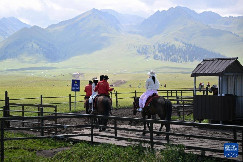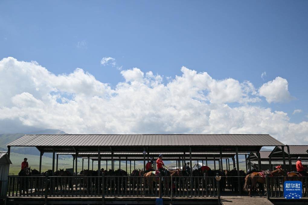 8月3日,那拉提草原马队的骑手骑着马匹准备迎接游客。