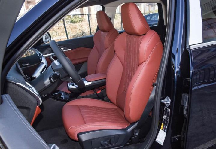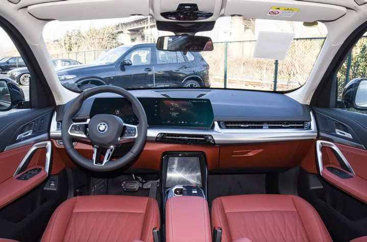 目光聚焦在车内部分,新款宝马iX1采用了比较鲜明的色彩搭配,通过黑色+珊瑚红撞色设计,将前排座舱干净地区分为多个区域,例如座椅通体采用珊瑚红配色,强调座椅舒适度的完整性,仪表台采用“三明治”式设计叠加,表层采用大面积软性搪塑材质包覆,中间采用银色镀铬金属装饰横贯衔接,底层采用珊瑚红配色材质连接主副驾驶门板扶手区域,形成了环抱式座舱既视感,辅以10.25英寸液晶仪表和10.7英寸中控屏的行车信息交互显示,科技感和豪华感迎合了主流消费人群的审美品味。